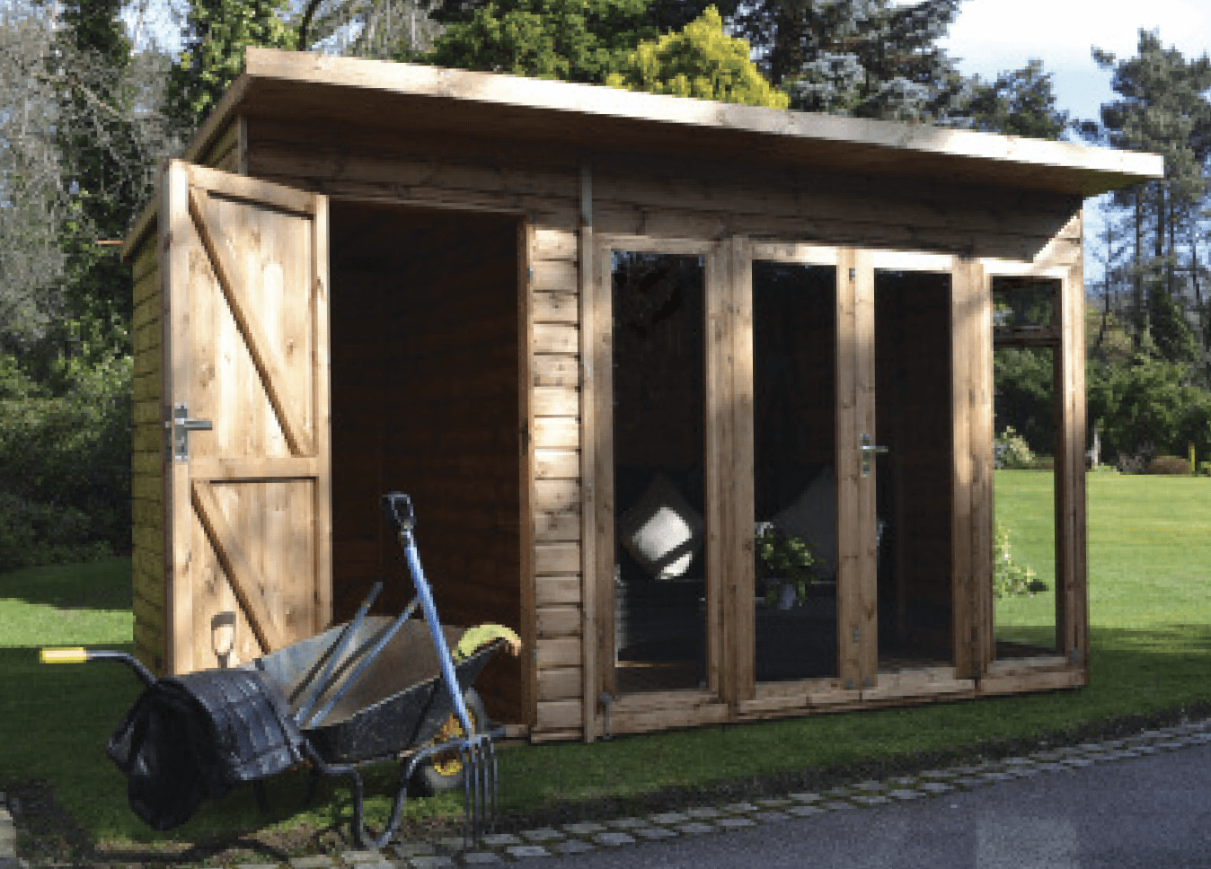 50x38mm framing, 50x50mm tanalised floor joists, fully rebated double doors and frame, 380mm roof overhang, toughened glass, modern glazing, mortice lock and handle, 1 top opening side window, modern style hinges and handles in a chrome finish, diagonal bracing, single shed door with handle and lock, internal partition, polyester roofing felt and 75x32mm roof framing.