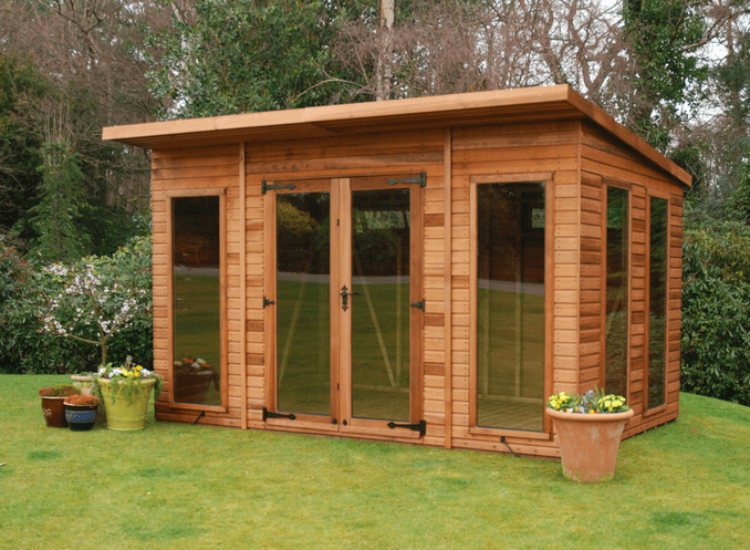 Modern toughened double glazed storm windows and doors, 50x50mm framing, 75x50mm roof framing, 50x50mm tanalised floor joists, fully rebated doors and frame, mortice lock and lever handle, polyester roofing felt, hurl window hinges, heavy duty door hinges, modern style chrome finish handles, diagonal bracing and 2 side top opening windows. 450mm roof projection.